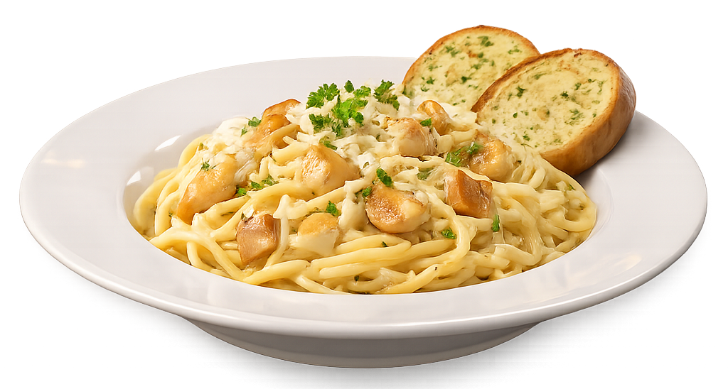 Salsa cremosa con parmesano y pasta al dente, con pollo o jamón.