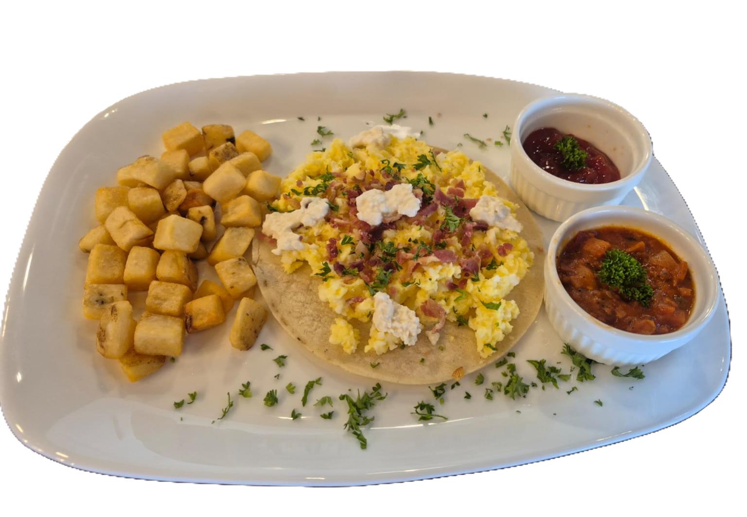 Huevos revueltos en tortilla de taco fresca, tocino, papas y salsa